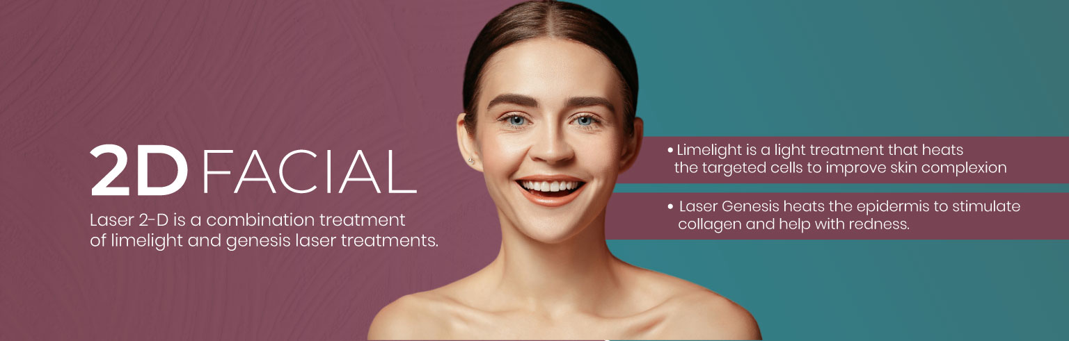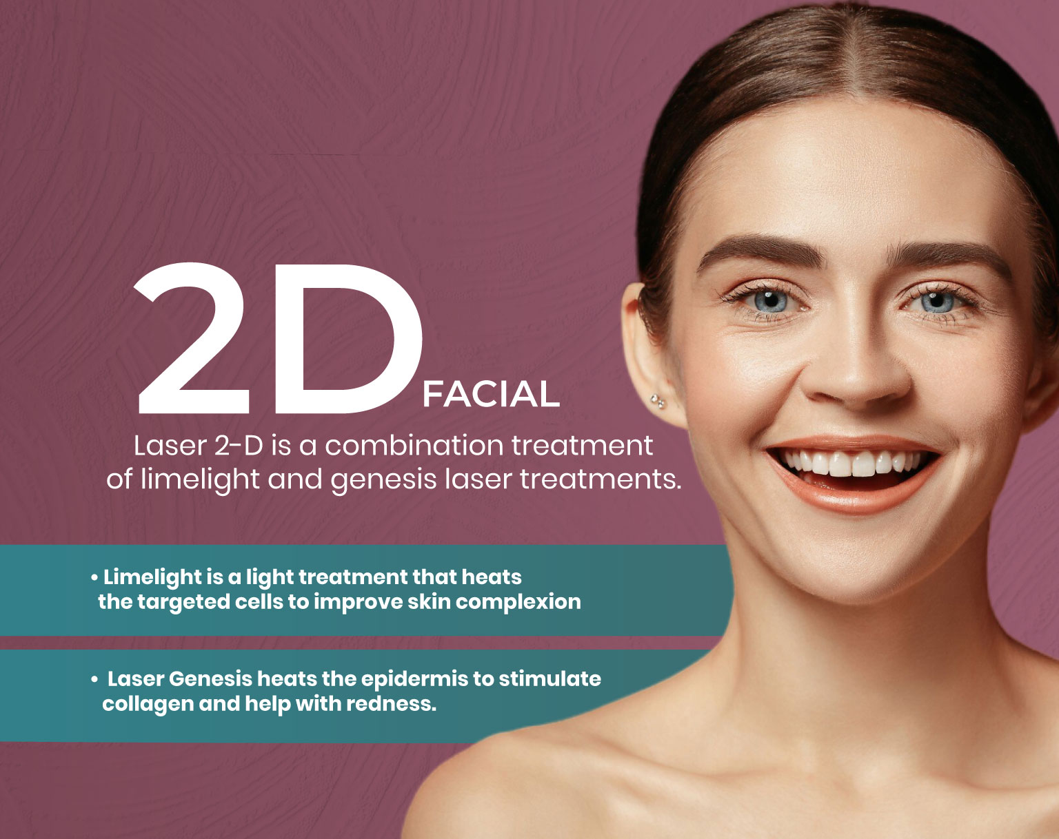 Laser 2-D is a combination treatment of limelight and genesis laser treatments. Limelight is a light treatment that heats the targeted cells to improve skin complexion. Laser Genesis heats the epidermis to stimulate collagen and help with redness.